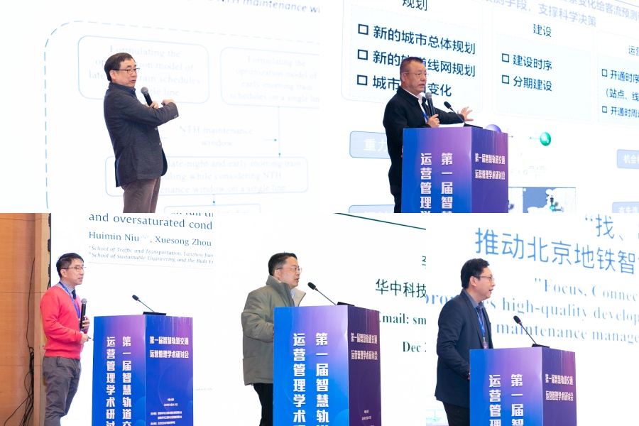 大会邀请了5位领域知名专家做主题报告。香港科技大学杨海教授作题为《考虑城市轨道交通系统非运营时段维修窗口需要的早间和夜间运营时刻表优化》的主题报告。北京交通发展研究院经理郭继孚作题为《基于图神经网络的轨道出行预测》的主题报告。美国亚利桑那州立大学周学松教授作题为《Flow Through Tensors: A New Computational Architecture for Layering Computational Graphs in Transportation Network Optimization》的主题报告。华中科技大学李志纯教授作题为《Urban rail line investment and economic growth》的主题报告。北京市地铁运营有限公司副部长刘赟曦作题为《“找、串、连”推动轨道交通智能运维高质量发展》的主题报告。