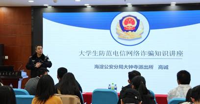 大钟寺派出所民警高诚围绕校园安全建设,为同学们带来防范网络诈骗专题讲座,结合真实案例剖析常见诈骗手法,切实提升新生的反诈意识与自我保护能力。
